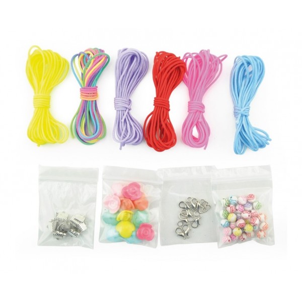 Conteúdo: cordas de nylon, miçangas, anéis de metal e fechos.