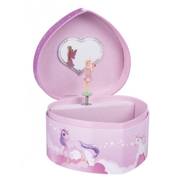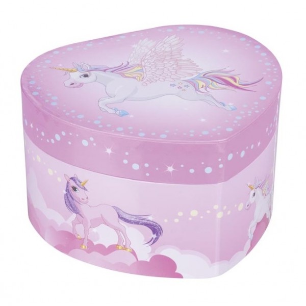 Caixa de musica em forma de coração ilustrada com um bonito unicórnio na tampa.