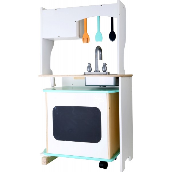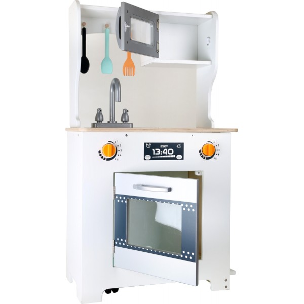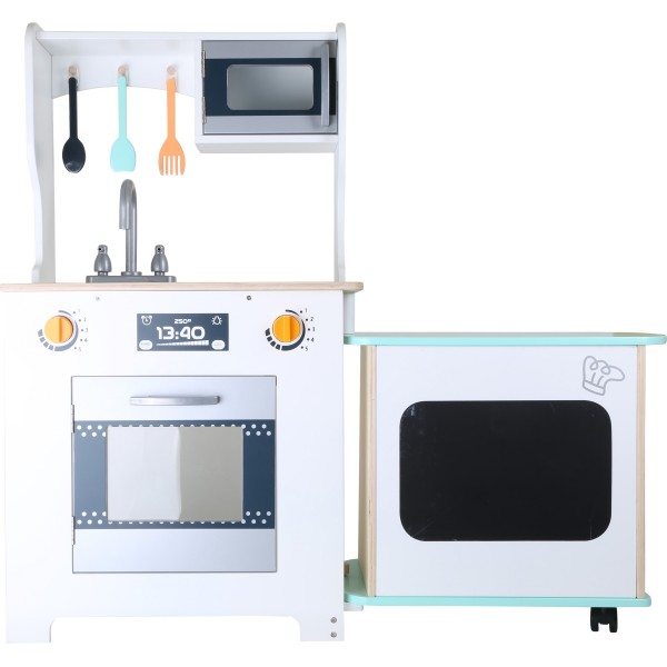 A parte de trás do forno tem um quadro negro para pequenas notas e pode ser empurrada como balcão. Uma cozinha muito moderna é essencial em qualquer casa. Esta robusta cozinha infantil de madeira é ideal para pequenos chefs famosos.Todos os principais aparelhos de cozinha estão incluídos. O melhor: vem com uma barra para ganhar mais espaço, pode ser empurrada para dentro e para fora e a receita de hoje está escrita no quadro.