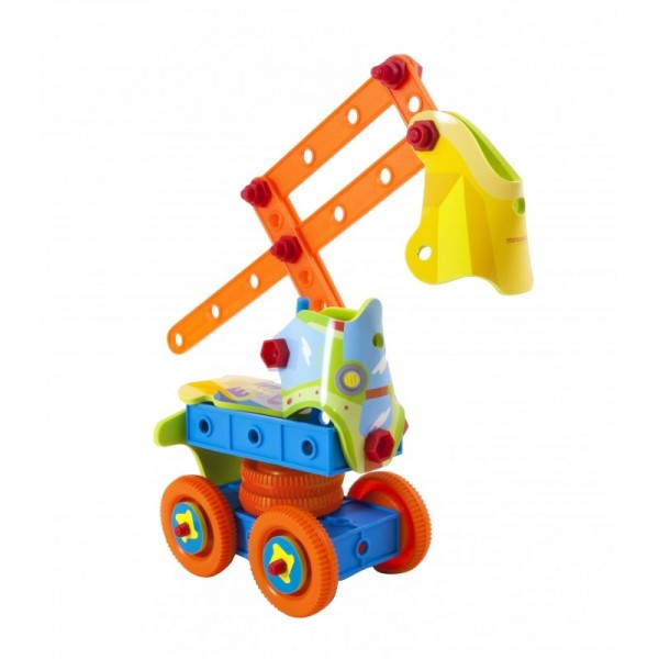 placas, porcas e parafusos e constroi um carro de corrida, uma grua