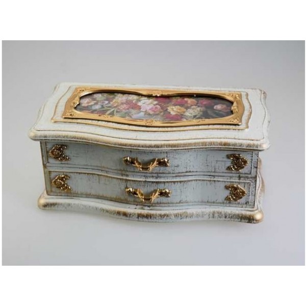 Guarda-joias em branco antigo com uma gaveta e uma imagem de flor na tampa.