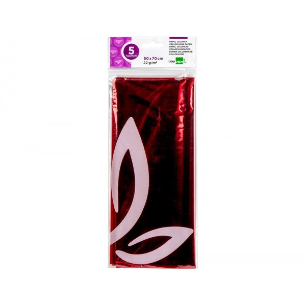 Papel celofane 50x70 cm, bolsa de 5 folhas vermelhas.