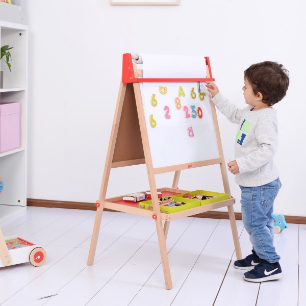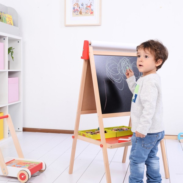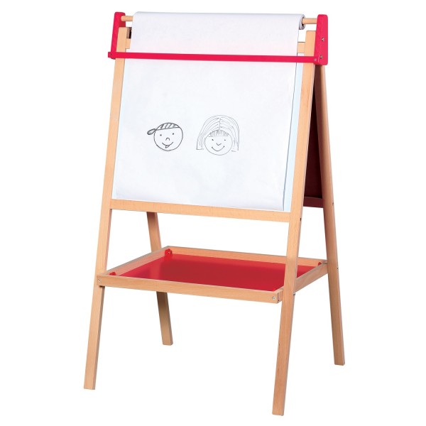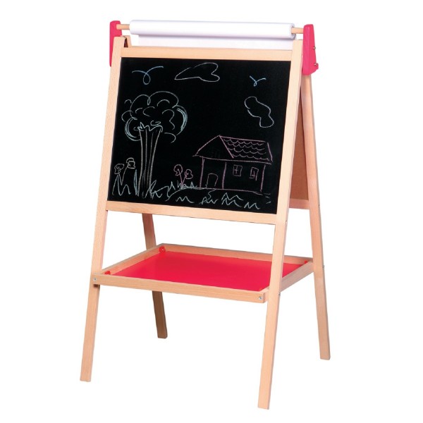 Bonito cavalete infantil tradicional em vermelho e natural.
