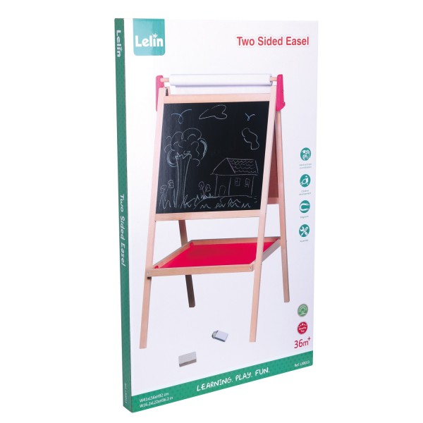 Inclui: quadro-negro, quadro branco magnético, bandeja de madeira para guardar acessórios, rolo de papel, borracha e pacote de giz.