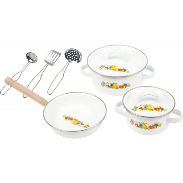 Contem: 3 utensílios de cozinha, 1 frigideira, 2 tachos com